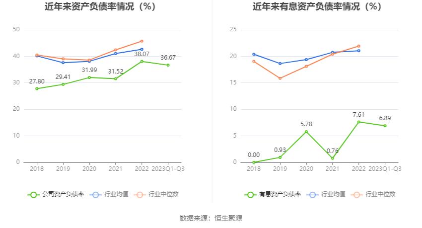 在偿债能力方面,公司2023年三季度末资产负债率为36.67%,相比上年末下降1.40个百分点;有息资产负债率为6.89%,相比上年末下降0.72个百分点。