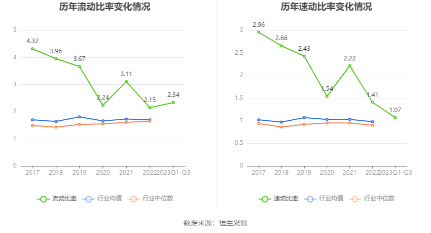 2023年前三季度,公司流动比率为2.34,速动比率为1.07。