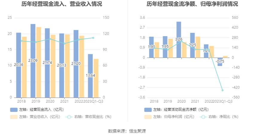 2023年前三季度,公司营业收入现金比为112.43%,净现比为-458.65%。