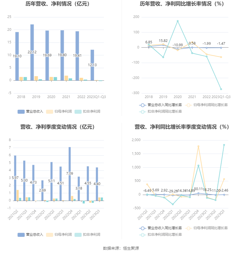 根据三季报,公司第三季度实现营业总收入4.4亿元,同比下降2.46%,环比下降3.25%;归母净利润4346.38万元,同比增长569.88%,环比增长258.39%;扣非净利润4220.43万元,同比增长1827.54%,环比增长247.52%。