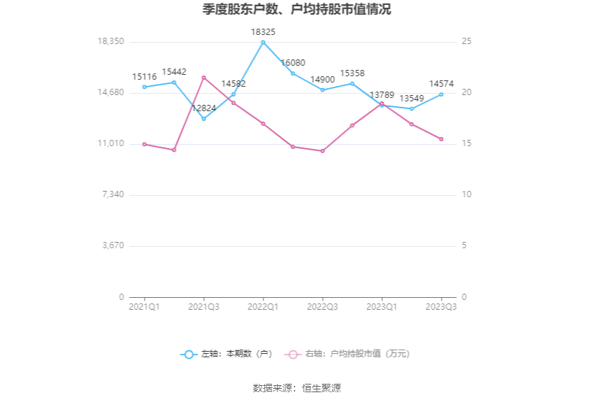 筹码集中度方面,截至2023年三季度末,公司股东总户数为1.46万户,较上半年末增长了1025户,增幅7.57%;户均持股市值由上半年末的16.95万元下降至15.49万元,降幅为8.61%。