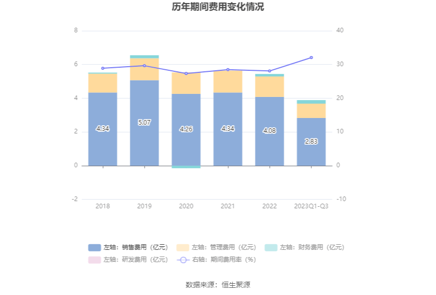 2023年前三季度,公司期间费用为3.89亿元,较上年同期减少120.66万元;但期间费用率为32.06%,较上年同期上升0.37个百分点。其中,销售费用同比下降1.45%,管理费用同比增长0.9%,研发费用为10.65万元,财务费用同比增长11.13%。