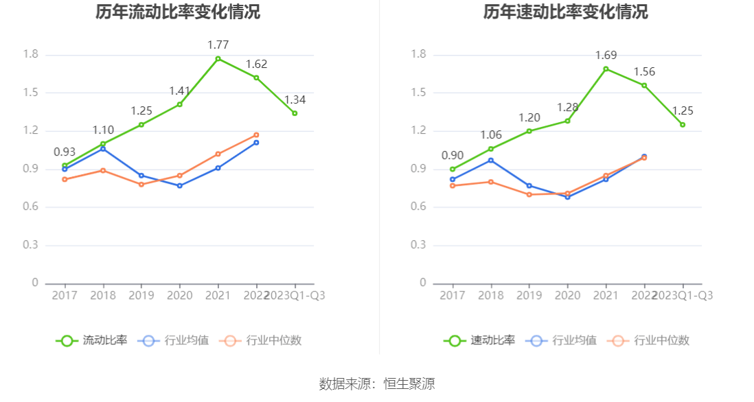 2023年前三季度,公司流动比率为1.34,速动比率为1.25。