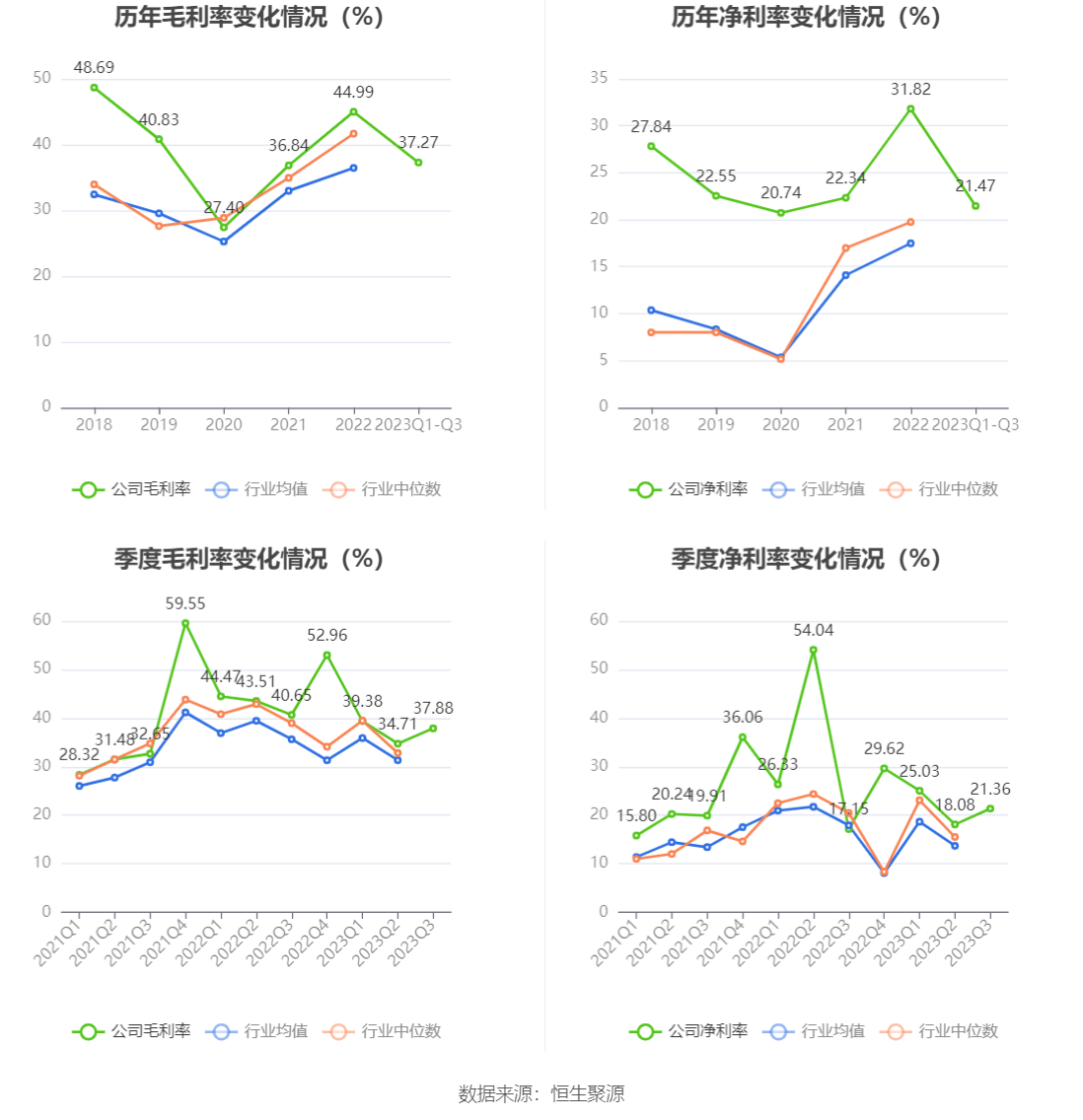 2023年前三季度,公司毛利率为37.27%,同比下降5.51个百分点;净利率为21.47%,较上年同期下降10.96个百分点。从单季度指标来看,2023年第三季度公司毛利率为37.88%,同比下降2.77个百分点,环比上升3.17个百分点;净利率为21.36%,较上年同期上升4.21个百分点,较上一季度上升3.28个百分点。