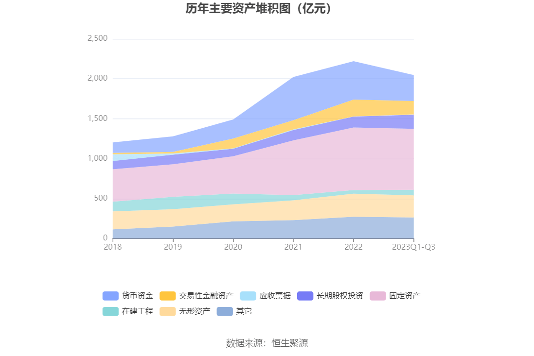 资产重大变化方面,截至2023年三季度末,公司货币资金较上年末减少32.19%,占公司总资产比重下降5.72个百分点;其他非流动资产较上年末减少92.93%,占公司总资产比重下降3.63个百分点;长期股权投资较上年末增加29.81%,占公司总资产比重上升2.51个百分点;固定资产较上年末减少2.66%,占公司总资产比重上升1.95个百分点。