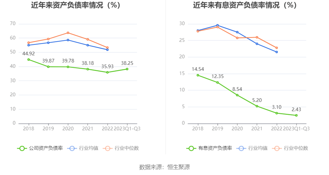 在偿债能力方面,公司2023年三季度末资产负债率为38.25%,相比上年末上升3.40个百分点;有息资产负债率为2.43%,相比上年末下降0.67个百分点。