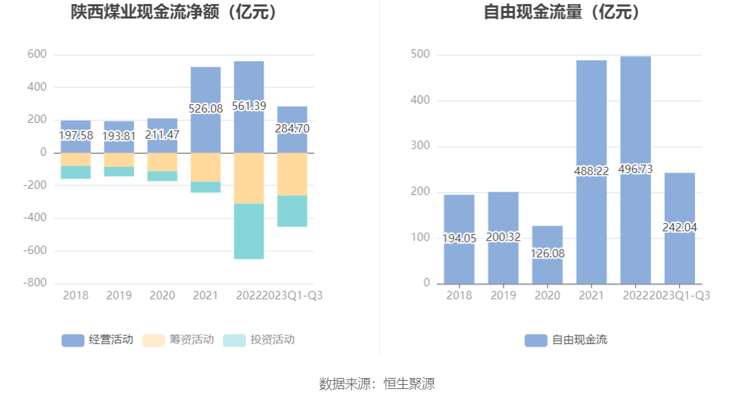 2023年前三季度,公司经营活动现金流净额为284.70亿元,同比下降34.43%,主要系本期煤炭价格波动下行使经营活动现金流量减少所致;筹资活动现金流净额-261.40亿元,同比减少70.92亿元;投资活动现金流净额-191.24亿元,上年同期为-13.73亿元。