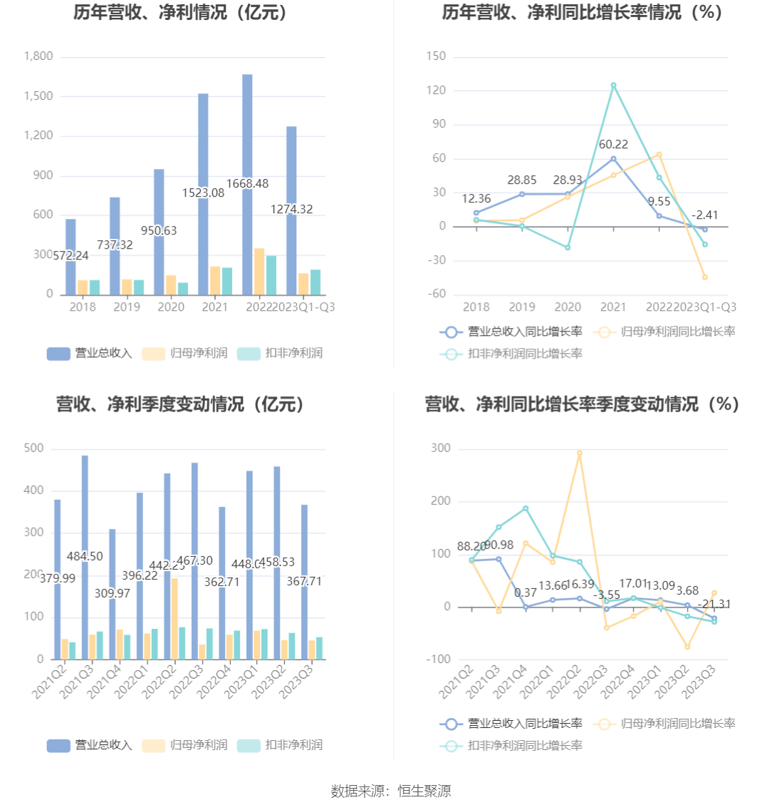 根据三季报,公司第三季度实现营业总收入367.71亿元,同比下降21.31%,环比下降19.81%;归母净利润46.01亿元,同比增长27.07%,环比下降1.43%;扣非净利润53.64亿元,同比下降27.91%,环比下降15.72%。