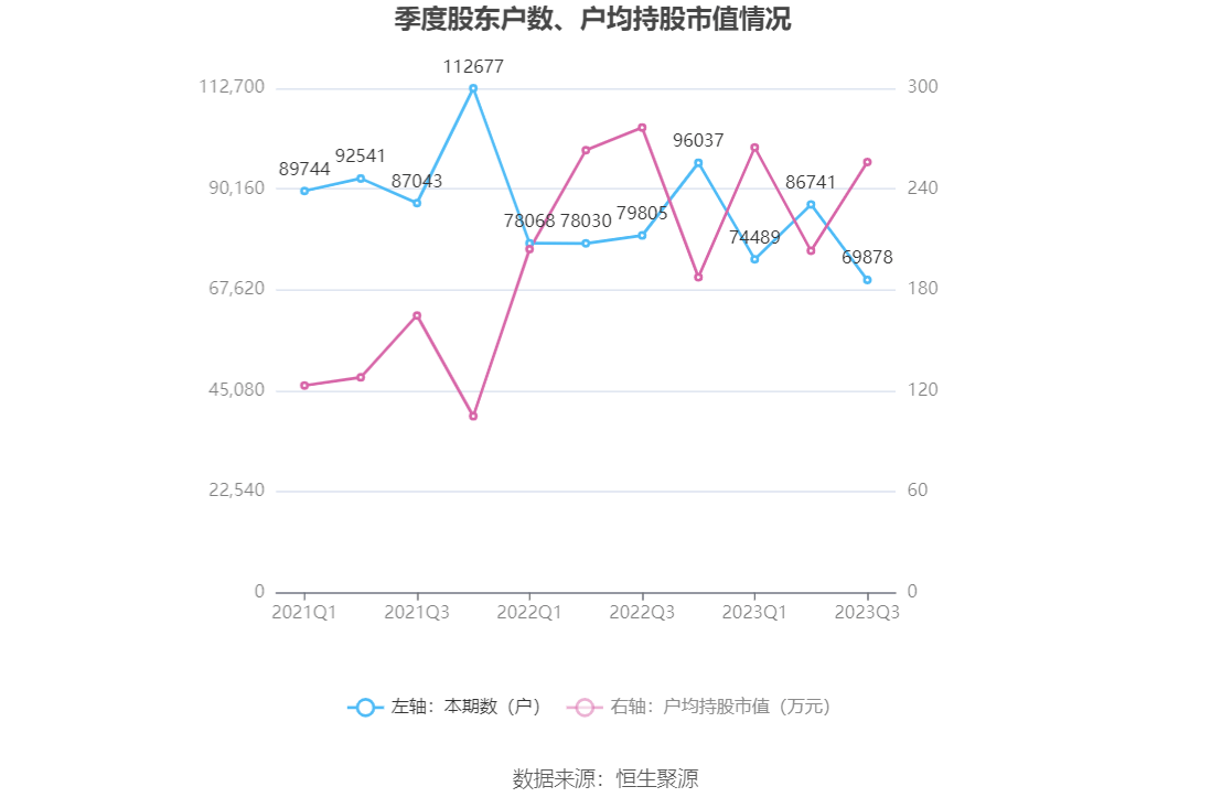 筹码集中度方面,截至2023年三季度末,公司股东总户数为6.99万户,较上半年末下降了1.69万户,降幅19.44%;户均持股市值由上半年末的203.31万元上升至256.12万元,增幅为25.98%。