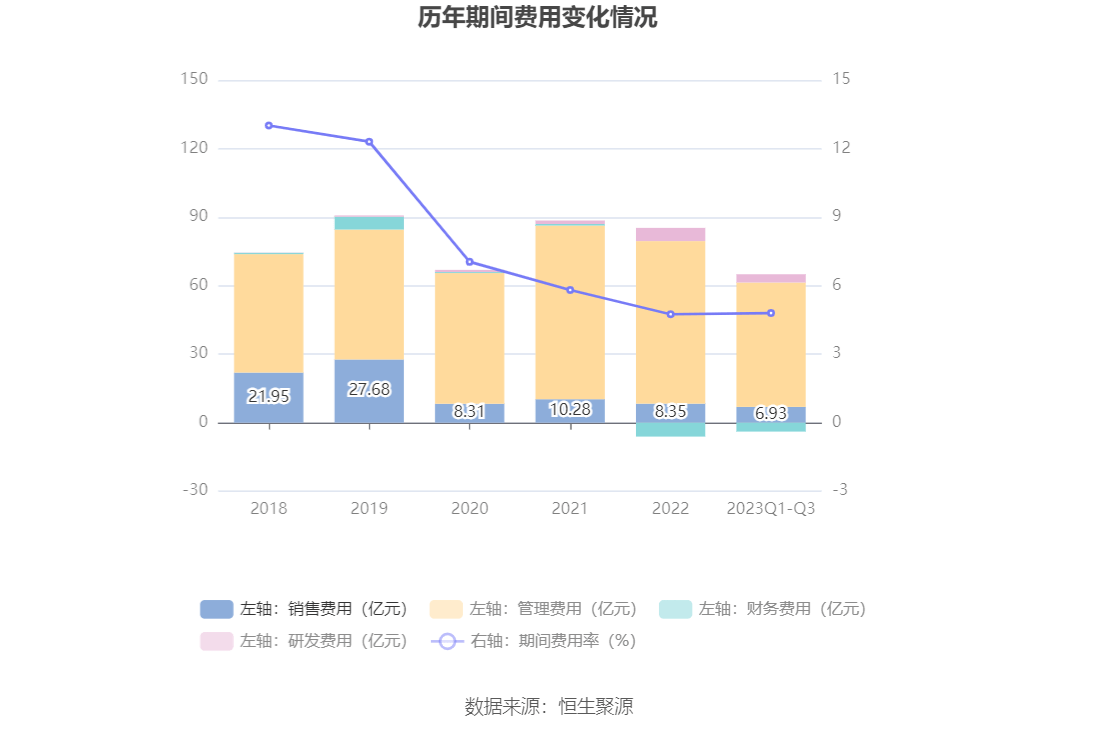 2023年前三季度,公司期间费用为61.11亿元,较上年同期减少4.46亿元;期间费用率为4.80%,较上年同期下降0.22个百分点。其中,销售费用同比增长15.09%,管理费用同比下降9.12%,研发费用同比增长83.1%,财务费用由去年同期的-2.35亿元变为-3.89亿元。