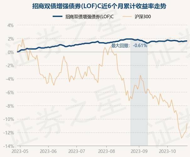 证券之星消息,10月27日,招商双债增强债券(LOF)C最新单位净值为1.4969元,累计净值为1.6359元,较前一交易日上涨0.01%。历史数据显示该基金近1个月上涨0.06%,近3个月上涨0.26%,近6个月上涨1.55%,近1年上涨2.46%。该基金近6个月的累计收益率走势如下图: