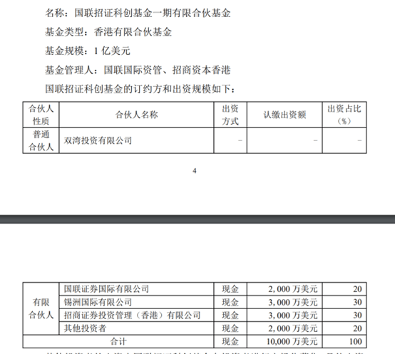 从上图可以看出,国联招证科创基金出资方主要为国联证券国际、锡洲国际和招商资本香港分别出资2000万美元、3000万美元、3000万美元,其他投资者出资为2000万美元。其他投资者的出资由国联招证科创基金向投资者进行市场化募集,具体出资方及出资金额尚不确定。