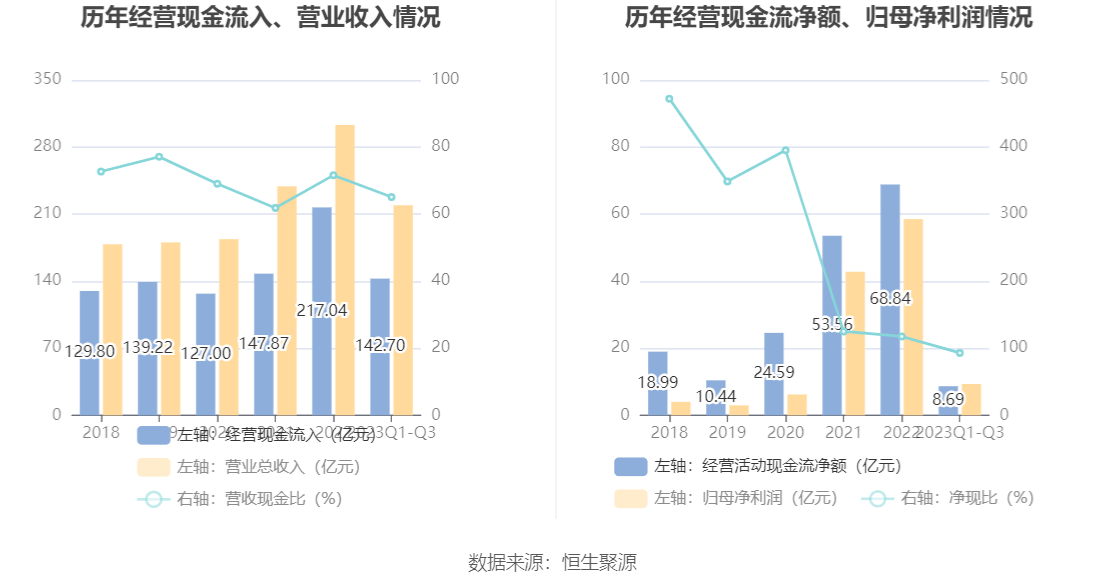 2023年前三季度,公司营业收入现金比为65.08%,净现比为93.09%。