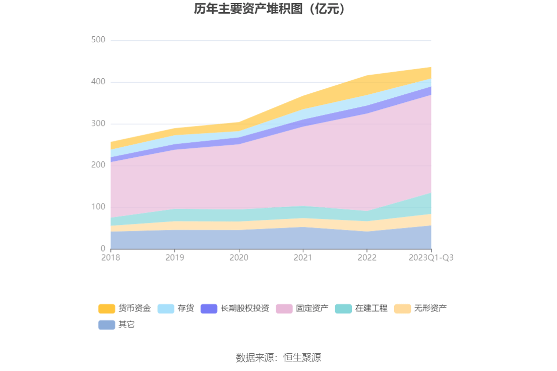 资产重大变化方面,截至2023年三季度末,公司在建工程较上年末增加106.63%,占公司总资产比重上升5.76个百分点;货币资金较上年末减少41.78%,占公司总资产比重下降5.04个百分点;固定资产较上年末增加0.49%,占公司总资产比重下降2.29个百分点;存货较上年末减少24.85%,占公司总资产比重下降1.72个百分点。