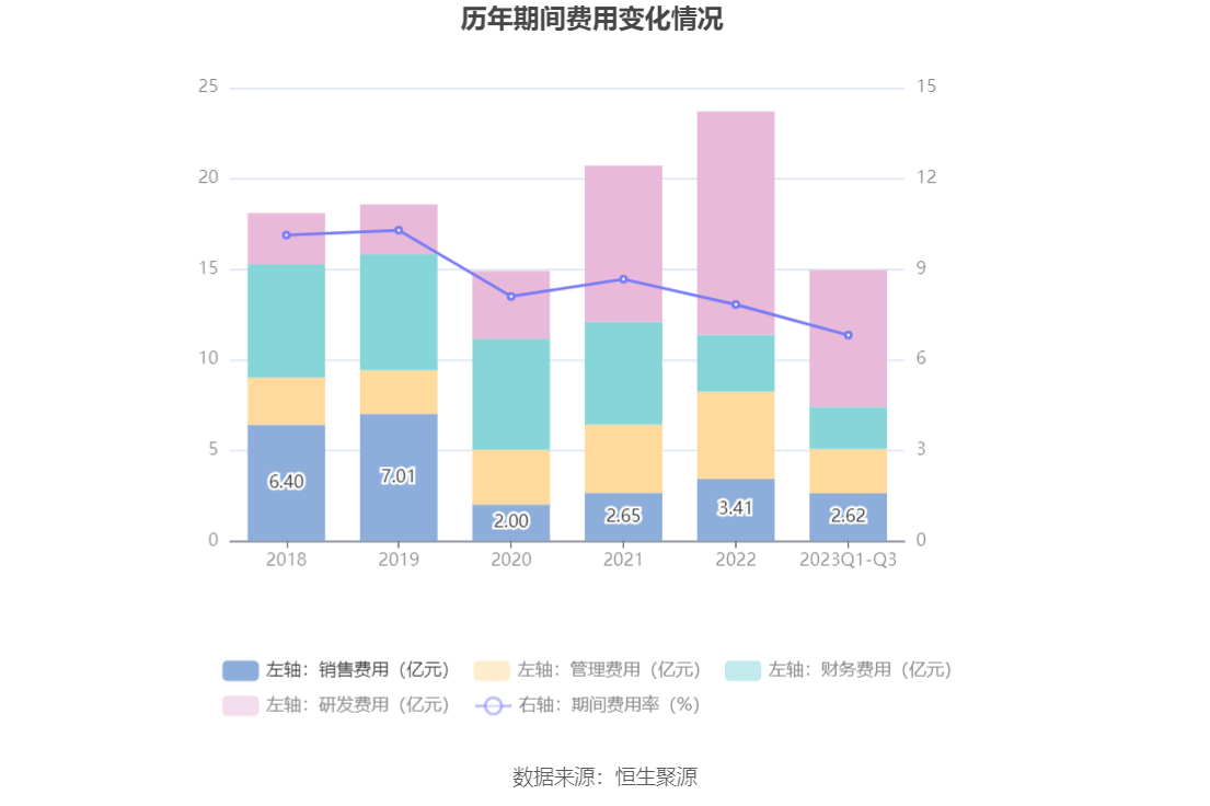 2023年前三季度,公司期间费用为14.94亿元,较上年同期减少2.35亿元;期间费用率为6.81%,较上年同期下降0.14个百分点。其中,销售费用同比下降8.57%,管理费用同比下降5.92%,研发费用同比下降20.23%,财务费用同比下降1.37%。