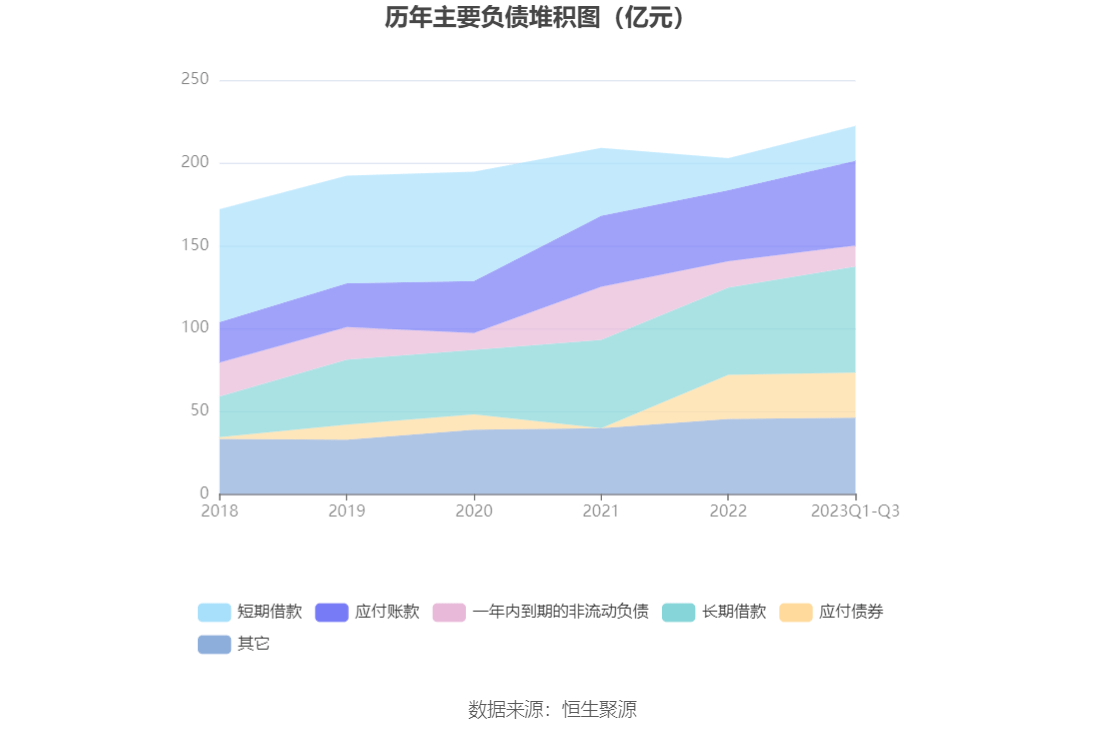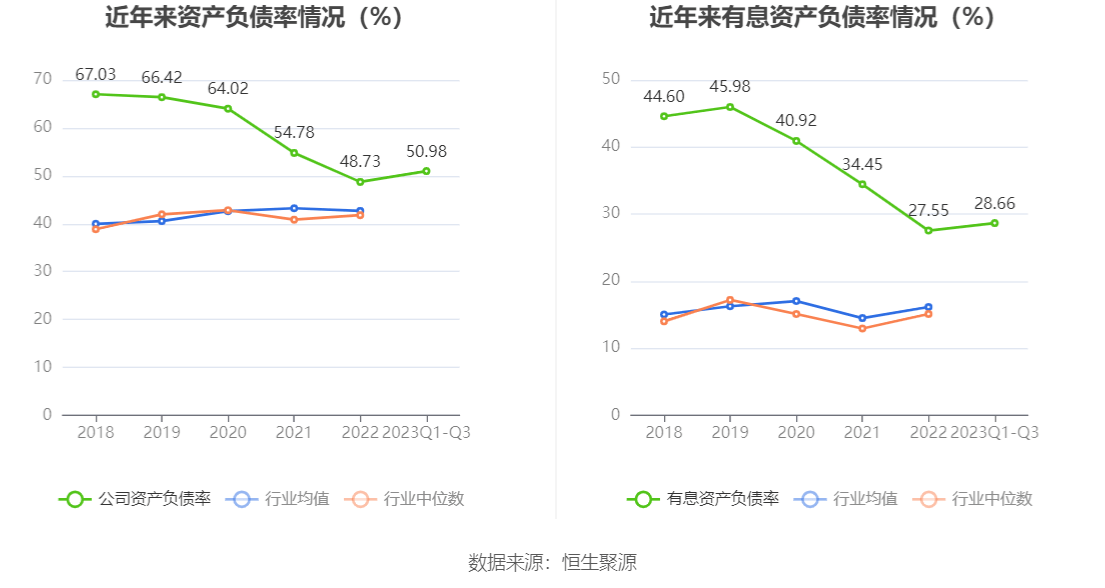 在偿债能力方面,公司2023年三季度末资产负债率为50.98%,相比上年末上升2.25个百分点;有息资产负债率为28.66%,相比上年末上升1.11个百分点。