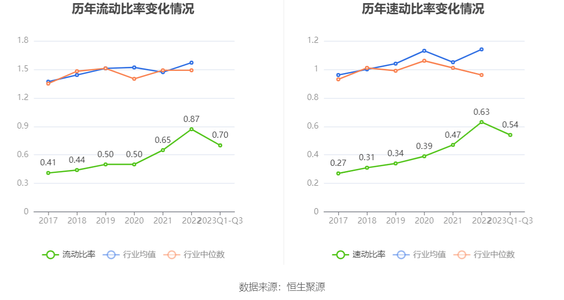 2023年前三季度,公司流动比率为0.70,速动比率为0.54。