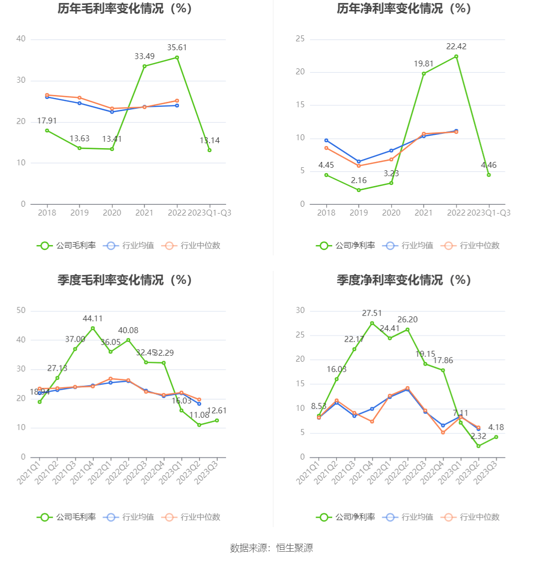 2023年前三季度,公司毛利率为13.14%,同比下降23.20个百分点;净利率为4.46%,较上年同期下降18.96个百分点。从单季度指标来看,2023年第三季度公司毛利率为12.61%,同比下降19.84个百分点,环比上升1.53个百分点;净利率为4.18%,较上年同期下降14.97个百分点,较上一季度上升1.86个百分点。