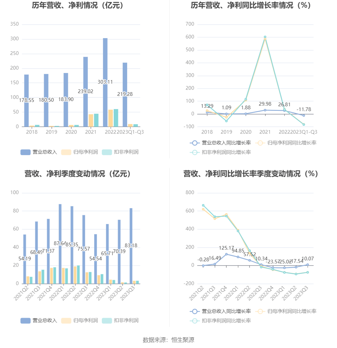 根据三季报,公司第三季度实现营业总收入83.18亿元,同比增长10.07%,环比增长18.18%;归母净利润3.25亿元,同比下降74.21%,环比增长104.20%;扣非净利润3.3亿元,同比下降74.43%,环比增长140.62%。