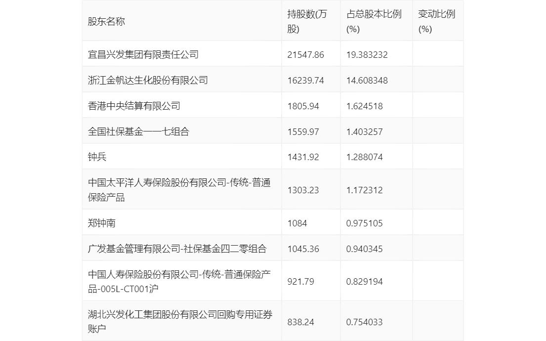 三季报显示,2023年三季度末公司十大流通股东中,新进股东为中国人寿保险股份有限公司-传统-普通保险产品-005L-CT001沪、湖北兴发化工集团股份有限公司回购专用证券账户,取代了上半年末的中庚价值先锋股票型证券投资基金、榕树新能源二期私募证券投资基金。在具体持股比例上,全国社保基金一一七组合、中国太平洋人寿保险股份有限公司-传统-普通保险产品、郑钟南持股有所上升,宜昌兴发集团有限责任公司、浙江金帆达生化股份有限公司、香港中央结算有限公司、广发基金管理有限公司-社保基金四二零组合持股有所下降。