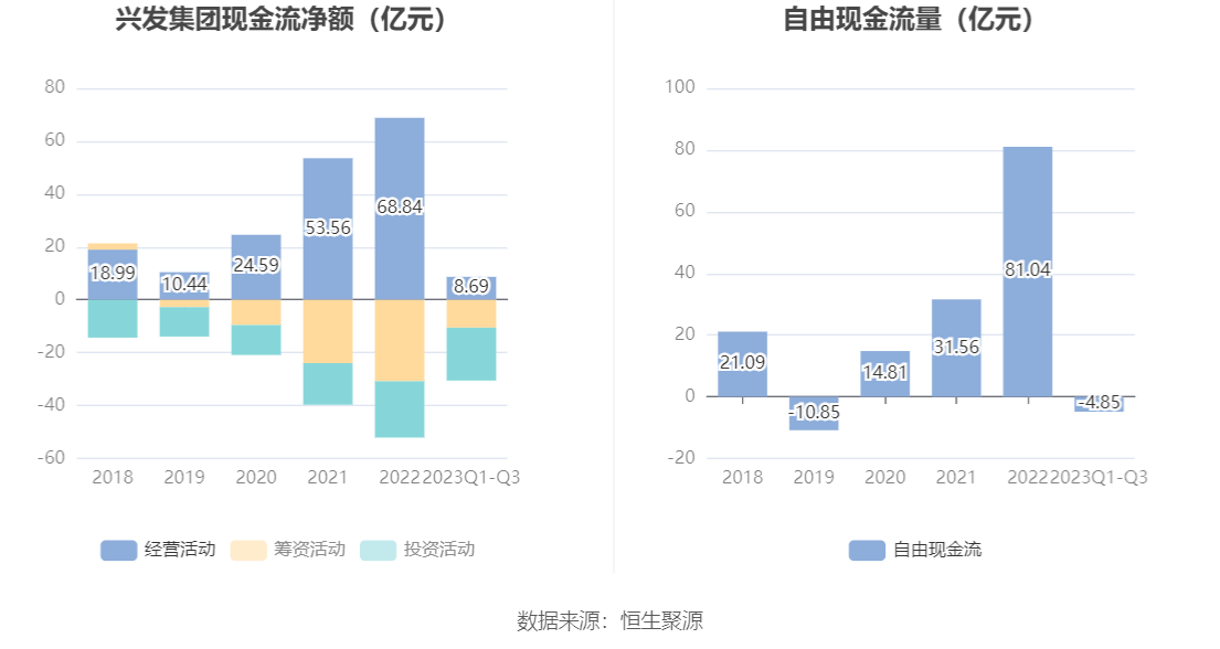 2023年前三季度,公司经营活动现金流净额为8.69亿元,同比下降85.82%,主要系报告期内销售商品等现金流入减少所致;筹资活动现金流净额-10.54亿元,同比增加11.82亿元;投资活动现金流净额-20.01亿元,上年同期为-13.82亿元。