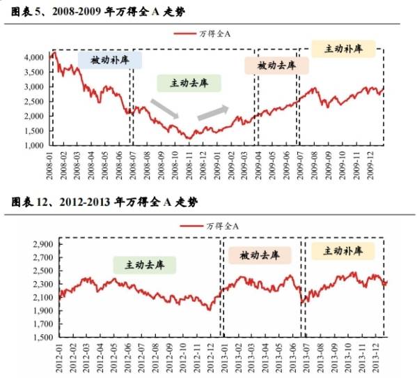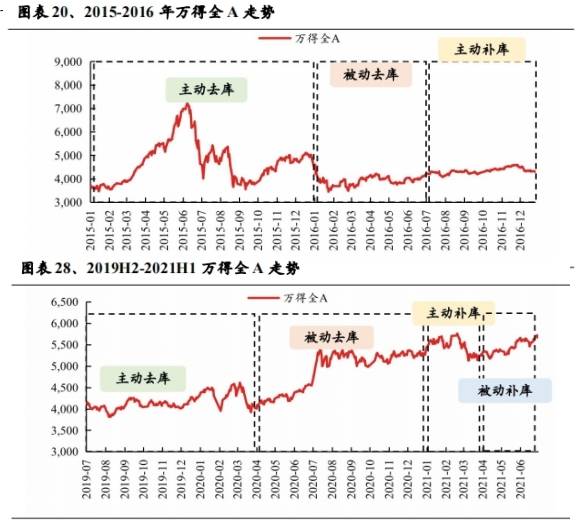 复盘过去四轮库存周期(2008-2009年、2012-2013年、2015-2016年、2020-2021年),张启尧等人认为,出于对未来库存周期切换、经济走向复苏的乐观预期,(万得全A)市场行情通常会在主动去库末期启动,并延续至主动补库初期。2009年的经济强复苏驱动下,指数涨势持续演绎;2016年初两次“熔断”短暂地中断了指数的上涨,但后续指数又重新回到上行通道;2020年初的疫情冲击也并未能改变指数向上趋势。