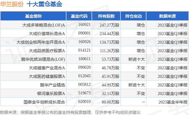 根据2023基金Q3季报公募基金重仓股数据,重仓该股的公募基金共9家,其中持有数量最多的公募基金为大成多策略混合(LOF)A。大成多策略混合(LOF)A目前规模为8.43亿元,最新净值1.328(10月24日),较上一交易日上涨1.61%,近一年下跌8.29%。该公募基金现任基金经理为邹建。邹建在任的基金产品包括:大成创业板两年定开混合A,管理时间为2021年1月26日至今,期间收益率为-34.01%;大成品质医疗股票A,管理时间为2022年10月31日至今,期间收益率为-6.89%;大成锐见未来混合A,管理时间为2023年9月21日至今,期间收益率为nan%。