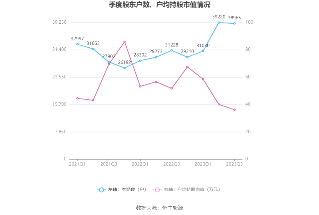 筹码集中度方面,截至2023年三季度末,公司股东总户数为3.9万户,较上半年末下降了255户,降幅0.65%;户均持股市值由上半年末的40.13万元下降至36.18万元,降幅为9.84%。
