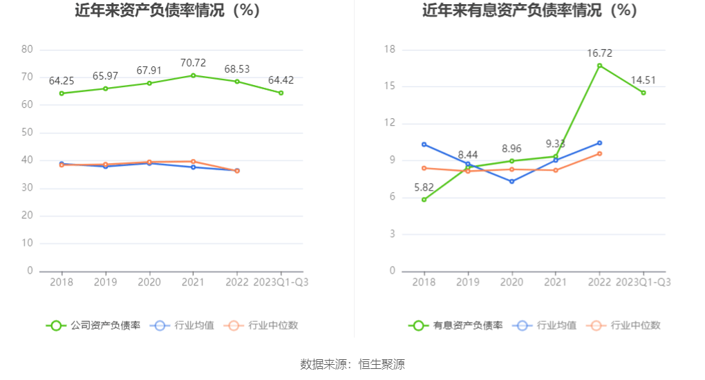 在偿债能力方面,公司2023年三季度末资产负债率为64.42%,相比上年末下降4.11个百分点;有息资产负债率为14.51%,相比上年末下降2.21个百分点。