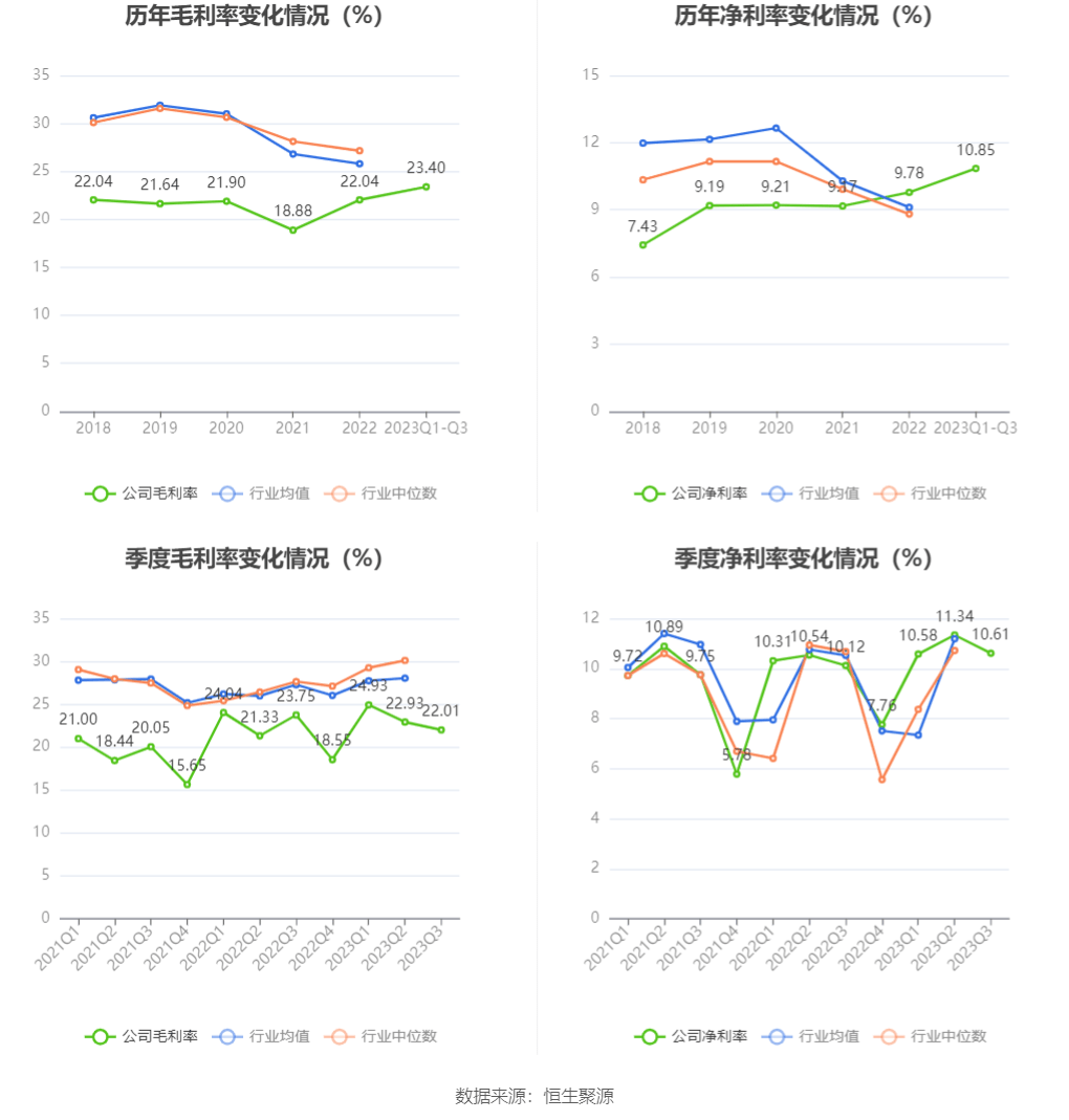 2023年前三季度,公司毛利率为23.40%,同比上升0.40个百分点;净利率为10.85%,较上年同期上升0.52个百分点。从单季度指标来看,2023年第三季度公司毛利率为22.01%,同比下降1.74个百分点,环比下降0.92个百分点;净利率为10.61%,较上年同期上升0.49个百分点,较上一季度下降0.73个百分点。