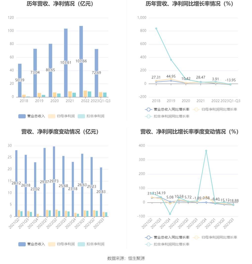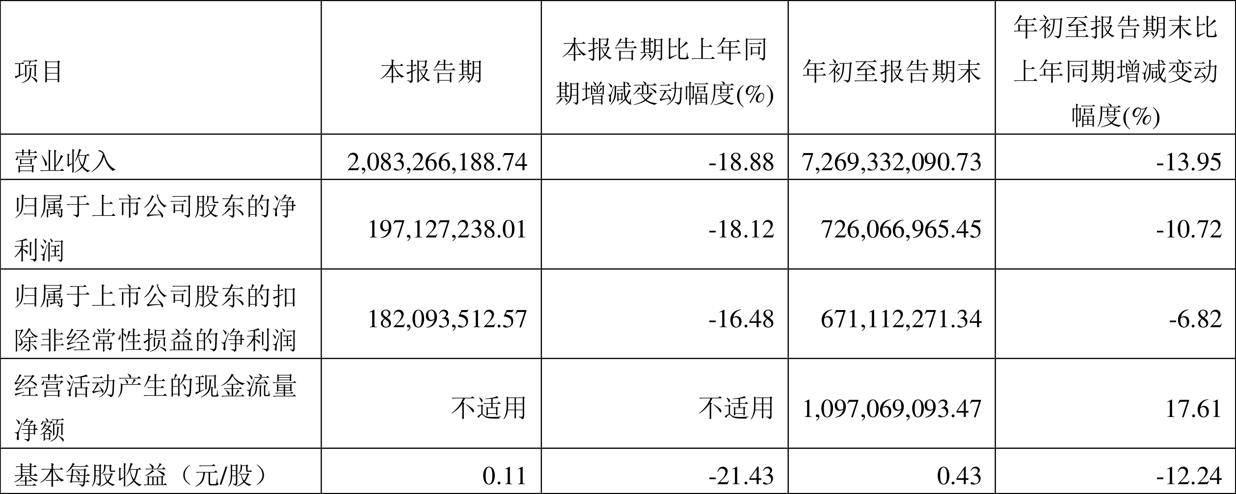 根据三季报,公司第三季度实现营业总收入20.83亿元,同比下降18.88%,环比下降17.43%;归母净利润1.97亿元,同比下降18.12%,环比下降26.06%;扣非净利润1.82亿元,同比下降16.48%,环比下降25.43%。