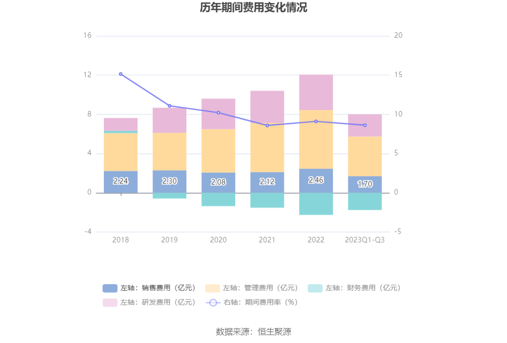 2023年前三季度,公司期间费用为6.27亿元,较上年同期减少8232.34万元;但期间费用率为8.62%,较上年同期上升0.23个百分点。其中,销售费用同比增长6.06%,管理费用同比增长0.44%,研发费用同比下降27.35%,财务费用由去年同期的-1.66亿元变为-1.74亿元。