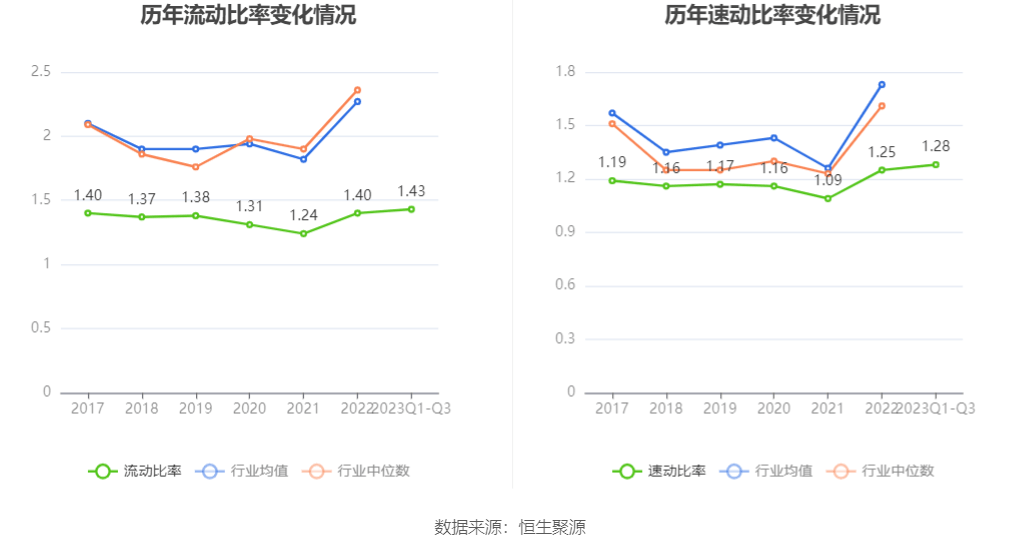 2023年前三季度,公司流动比率为1.43,速动比率为1.28。