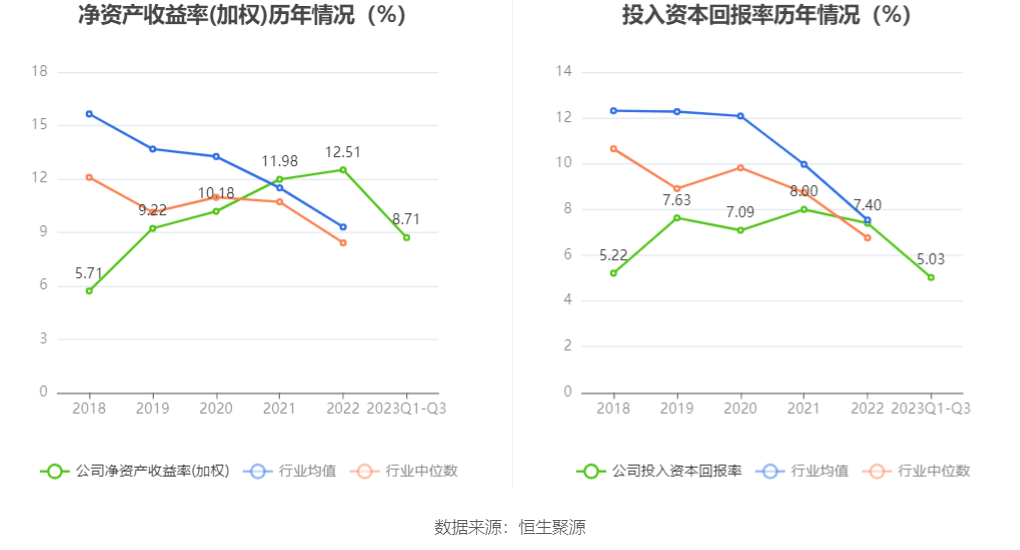 数据显示,2023年前三季度公司加权平均净资产收益率为8.71%,较上年同期下降1.69个百分点;公司2023年前三季度投入资本回报率为5.03%,较上年同期下降1.38个百分点。