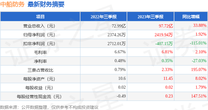 据证券之星公开数据整理,近期中船防务(600685)发布2023年三季报。根据财报显示,本报告期中中船防务营收净利润同比双双增长,三费占比上升明显。截至本报告期末,公司营业总收入97.72亿元,同比上升33.88%,归母净利润2419.94万元,同比上升1.92%。按单季度数据看,第三季度营业总收入37.9亿元,同比上升25.16%,第三季度归母净利润1153.41万元,同比上升139.61%。