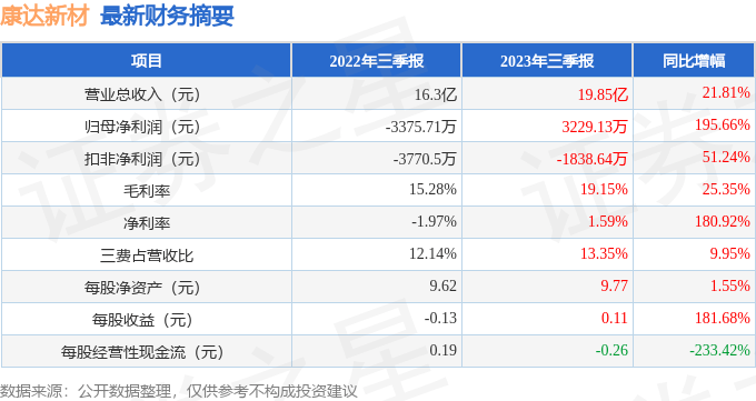 据证券之星公开数据整理,近期康达新材(002669)发布2023年三季报。根据财报显示,本报告期中康达新材营收净利润同比双双增长,应收账款上升。截至本报告期末,公司营业总收入19.85亿元,同比上升21.81%,归母净利润3229.13万元,同比上升195.66%。按单季度数据看,第三季度营业总收入7.05亿元,同比上升29.79%,第三季度归母净利润-375.26万元,同比上升80.34%。