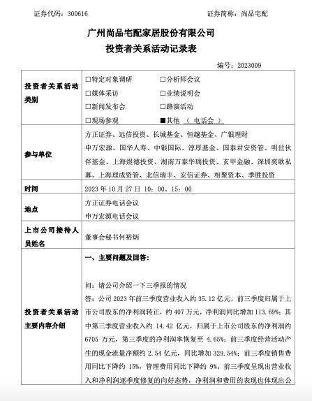 尚品宅配向投资者介绍了三季报的情况。公司2023年前三季度营业收入约35.12亿元,前三季度归属于上市公司股东的净利润转正,约407万元,净利润同比增加113.69%;其中第三季度营业收入约14.42亿元,归属于上市公司股东的净利润约6705万元,第三季度的净利润率恢复至4.65%;前三季度经营活动产生的现金流量净额约2.54亿元,同比增加329.54%;前三季度销售费用同比下降约15%,管理费用同比下降约9%。前三季度呈现出营业收入和净利润逐季度修复的向好态势,净利润和费用的表现也体现出公司在费用管控、提效降本、渠道调整上的成效。
