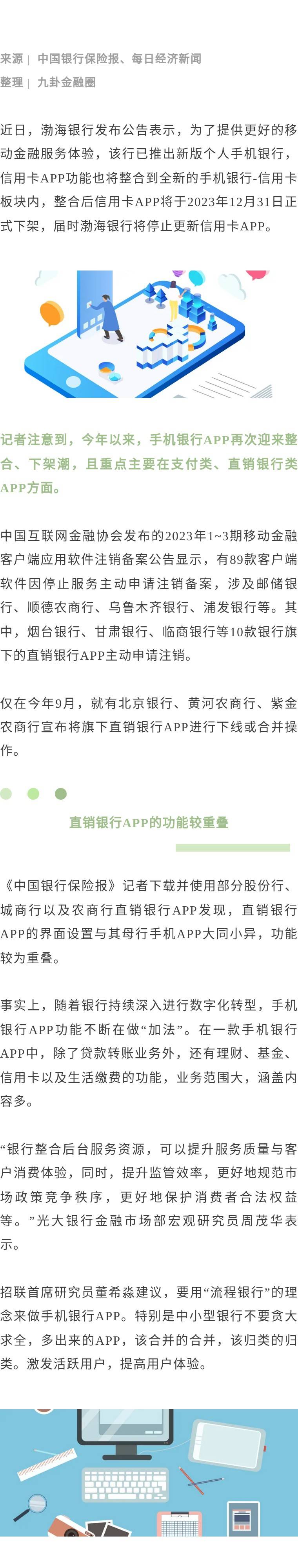 近日,渤海银行发布公告表示,为了提供更好的移动金融服务体验,该行已推出新版个人手机银行,信用卡APP功能也将整合到全新的手机银行-信用卡板块内,整合后信用卡APP将于2023年12月31日正式下架,届时渤海银行将停止更新信用卡APP。