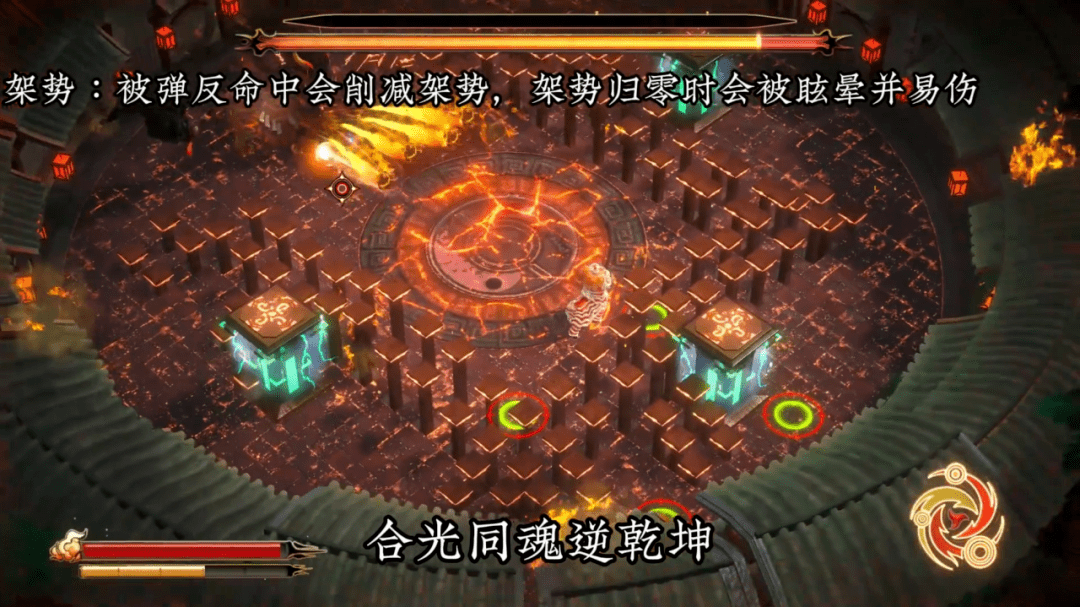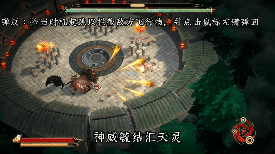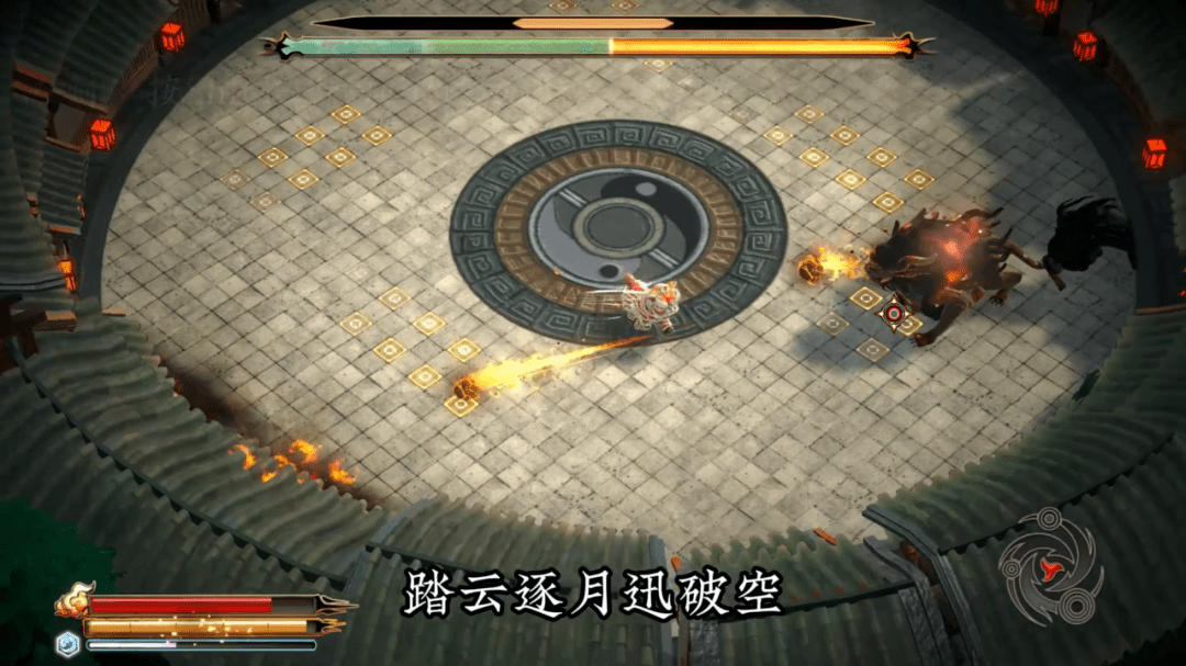 他在游戏中加入了类似网球运动的元素,可以疾驰、飞扑与射击——疾驰可以躲避,飞扑可以弹反进攻,射击绣球则可以主动出击,结合竞技场中动态升起的梅花桩,玩家便可一展舞狮的闪转腾挪,与异兽展开紧张刺激的战斗。