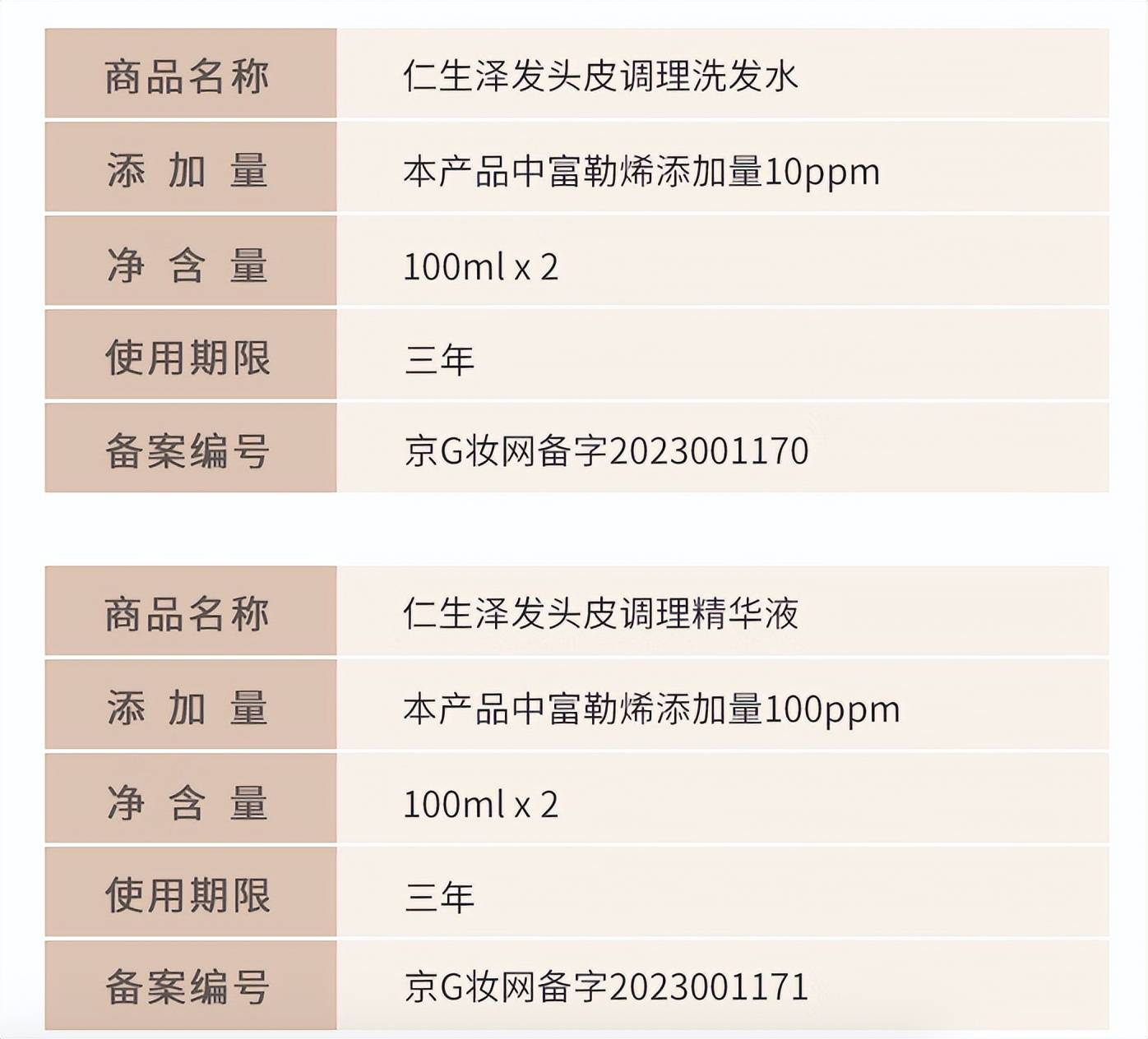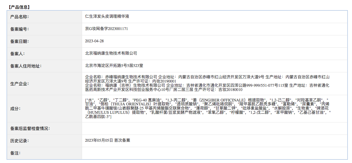 北京青年报旗下官方账号曾撰文指出任泽平在微博中贴出对比图,让人容易联想其有生发效果。但仁生泽发的相关产品按照普通化妆品备案,备案信息中仅有“清洁”和“保湿”字样,并未出现任何与“生发”“减少断发”“修护毛囊”等有关功效的描述。