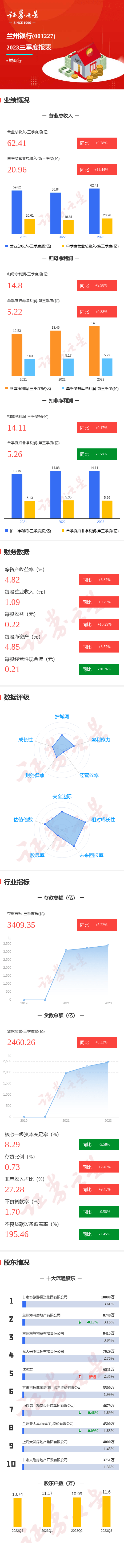 证券之星消息,兰州银行2023年三季报显示,公司主营收入62.41亿元,同比上升9.78%;归母净利润14.81亿元,同比上升9.98%;扣非净利润14.11亿元,同比上升0.17%;其中2023年第三季度,公司单季度主营收入20.97亿元,同比上升11.44%;单季度归母净利润5.22亿元,同比上升0.88%;单季度扣非净利润5.27亿元,同比下降1.58%;负债率92.82%,投资收益11.25亿元。
