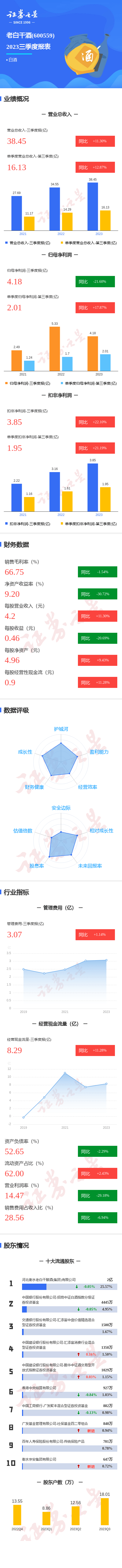证券之星消息,老白干酒2023年三季报显示,公司主营收入38.46亿元,同比上升11.3%;归母净利润4.18亿元,同比下降21.6%;扣非净利润3.86亿元,同比上升22.1%;其中2023年第三季度,公司单季度主营收入16.14亿元,同比上升12.87%;单季度归母净利润2.01亿元,同比上升17.87%;单季度扣非净利润1.96亿元,同比上升21.19%;负债率52.65%,投资收益1201.36万元,财务费用-1313.86万元,毛利率66.75%。