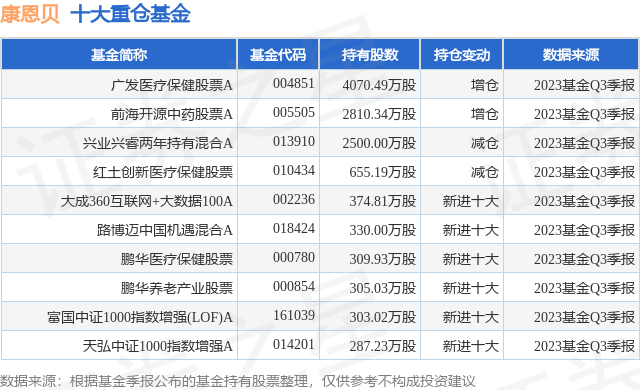 重仓康恩贝的前十大公募基金请见下表: