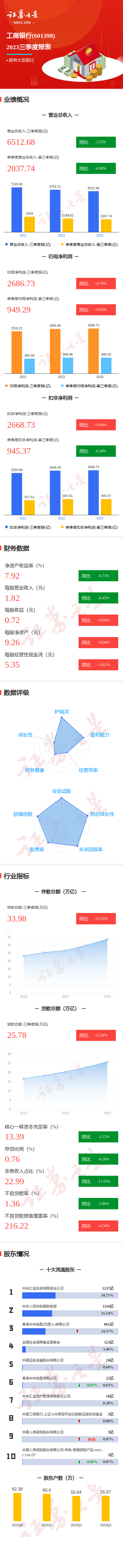 证券之星消息,工商银行2023年三季报显示,公司主营收入6512.68亿元,同比下降3.55%;归母净利润2686.73亿元,同比上升0.79%;扣非净利润2668.73亿元,同比上升0.89%;其中2023年第三季度,公司单季度主营收入2037.74亿元,同比下降6.08%;单季度归母净利润949.29亿元,同比上升0.03%;单季度扣非净利润945.37亿元,同比下降0.24%;负债率91.74%,投资收益376.11亿元。