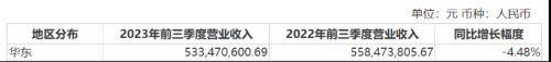 数据显示,2022年及2023年前三季度,华东地区的营收分别为7.29亿元、5.33亿元,分别同比下滑6.82%、4.48%。