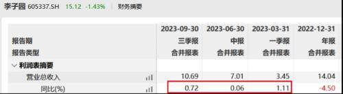 进入2023年,李子园的营收增长明显出现疲态。2023年一季度、中期、前三季度,其营收增速分别为1.11%、0.06%、0.72%。