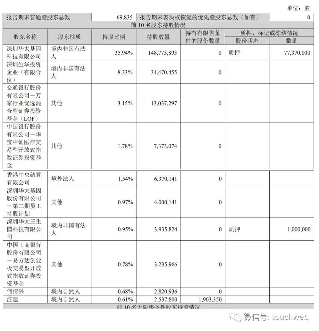 截至2023年9月30日,华大基因持股为35.94%,深圳前海华大基因投资企业(有限合伙)持股为8.33%,交通银行股份有限公司-万家行业优选混合型证券投资基金(LOF)持股为3.15%,中国银行股份有限公司-华宝中证医疗交易型开放式指数证券投资基金持股为1.78%,香港中央结算有限公司持股为1.54%;