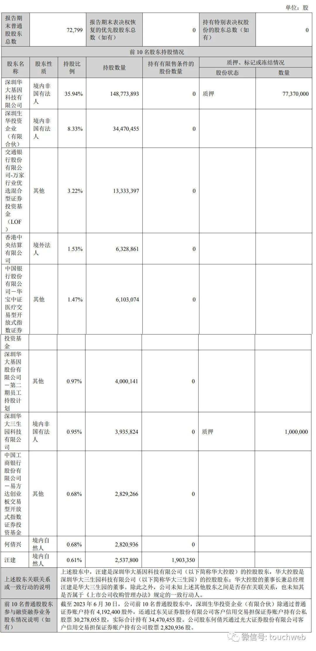 截至2023年6月30日,华大基因持股为35.94%,深圳前海华大基因投资企业(有限合伙)持股为8.33%,交通银行股份有限公司-万家行业优选混合型证券投资基金(LOF)持股为3.22%,香港中央结算有限公司持股为1.53%,中国银行股份有限公司-华宝中证医疗交易型开放式指数证券投资基金持股为1.47%,深圳华大基因股份有限公司-第二期员工持股计划持股为0.97%,深圳华大三生园科技有限公司持股0.95%;