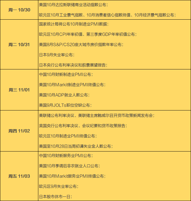 下周,美联储、英国央行和日本央行都将在下周公布利率决议。国家统计局将公布10月制造业采购经理指数(PMI)数据。A股3只新股申购。73家上市公司限售股解禁市值合计为1235.16亿元。