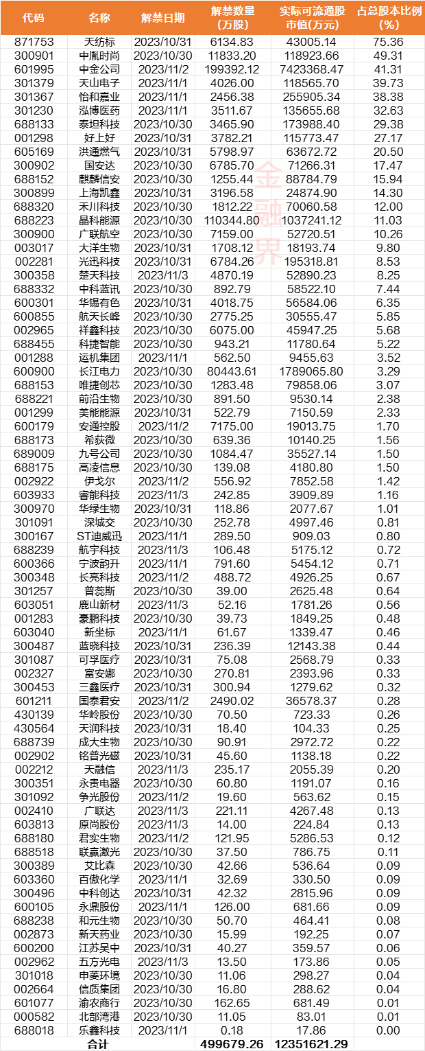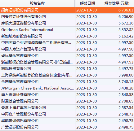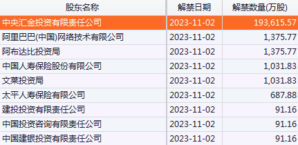 下周解禁数量最多的是中金公司,该公司将于2023年11月2日解禁19.94亿股,占总股本比例41.31%,解禁股类型是首发原股东限售股份及首发战略限售股份,以最新价计算,解禁市值约742.34亿元,解禁股东明细如下: